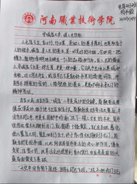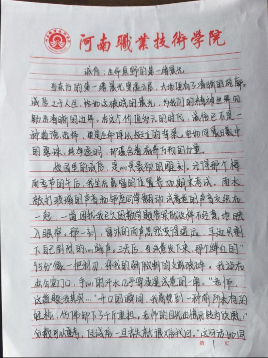 为进一步加强校园诚信文化建设,引导学生树立正确的诚信观念,营造诚实守信的良好氛围,yl6809永利皇宫于6月4日—10日圆满举办了以“诚信”为主题的征文活动。此次活动面向学院全体学生,得到了同学们的积极响应和广泛参与。