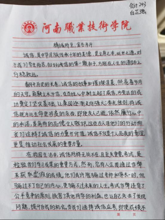 此次诚信主题征文活动的成功举办,不仅为同学们提供了一个展示自我、表达观点的平台,也进一步加强了学院的诚信教育,营造了浓厚的诚信文化氛围。yl6809永利皇宫将以此次活动为起点,持续推进诚信教育工作,通过丰富多彩的形式和活动,引导学生树立正确的价值观和人生观,培养更多具有诚信品质和社会责任感的高素质人才。