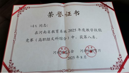 8月28日至31日,由河南省总工会、河南省教育厅主办,河南省教科文卫体工会和洛阳理工学院承办的河南省教育系统2025年度教学技能竞赛现场决赛成功举办。全省48所本科院校,62所高职院校共一万余名教职工参与本次赛事,最终选拔出180名选手晋级现场决赛,yl6809永利皇宫现代物流管理专业教师王春芳历经校内选拔、省级视频评审和现场决赛三个阶段,最终在高职组文科综合类别中获得全省第八名,荣获河南省教育系统教学技能竞赛一等奖。